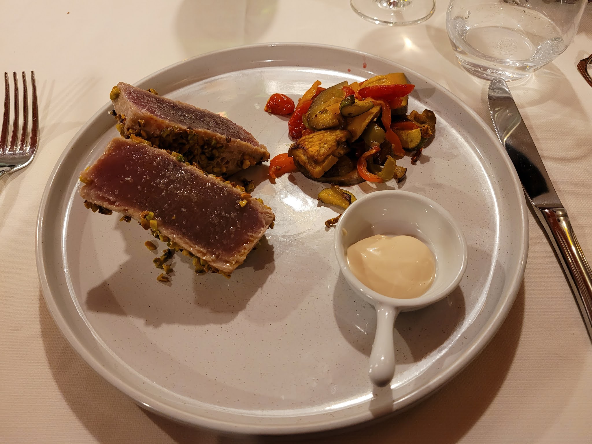 Secondo Piatto/Second Course: tuna steak encrusted with pistachios and vegetable ratatouille / tagliata di tonno con granella di pistacchio e ratatouille di verdure