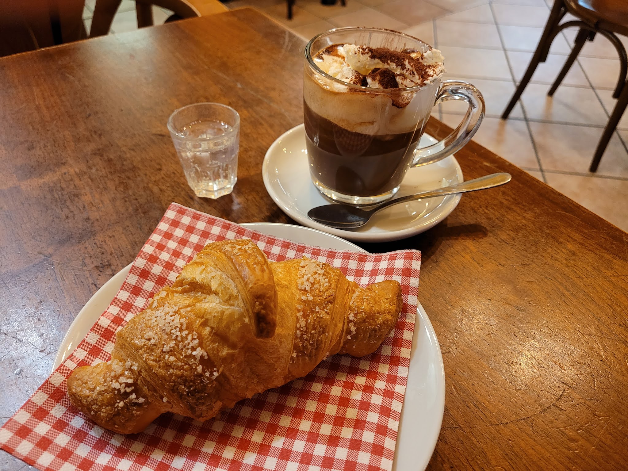 Prima di tutto iniziate la giornata con un croissant (ripieno di marmellata di albicocche) e un bicerin, una bevanda torinese a base di caffè, cioccolata calda densa (molto densa) e panna montata.
