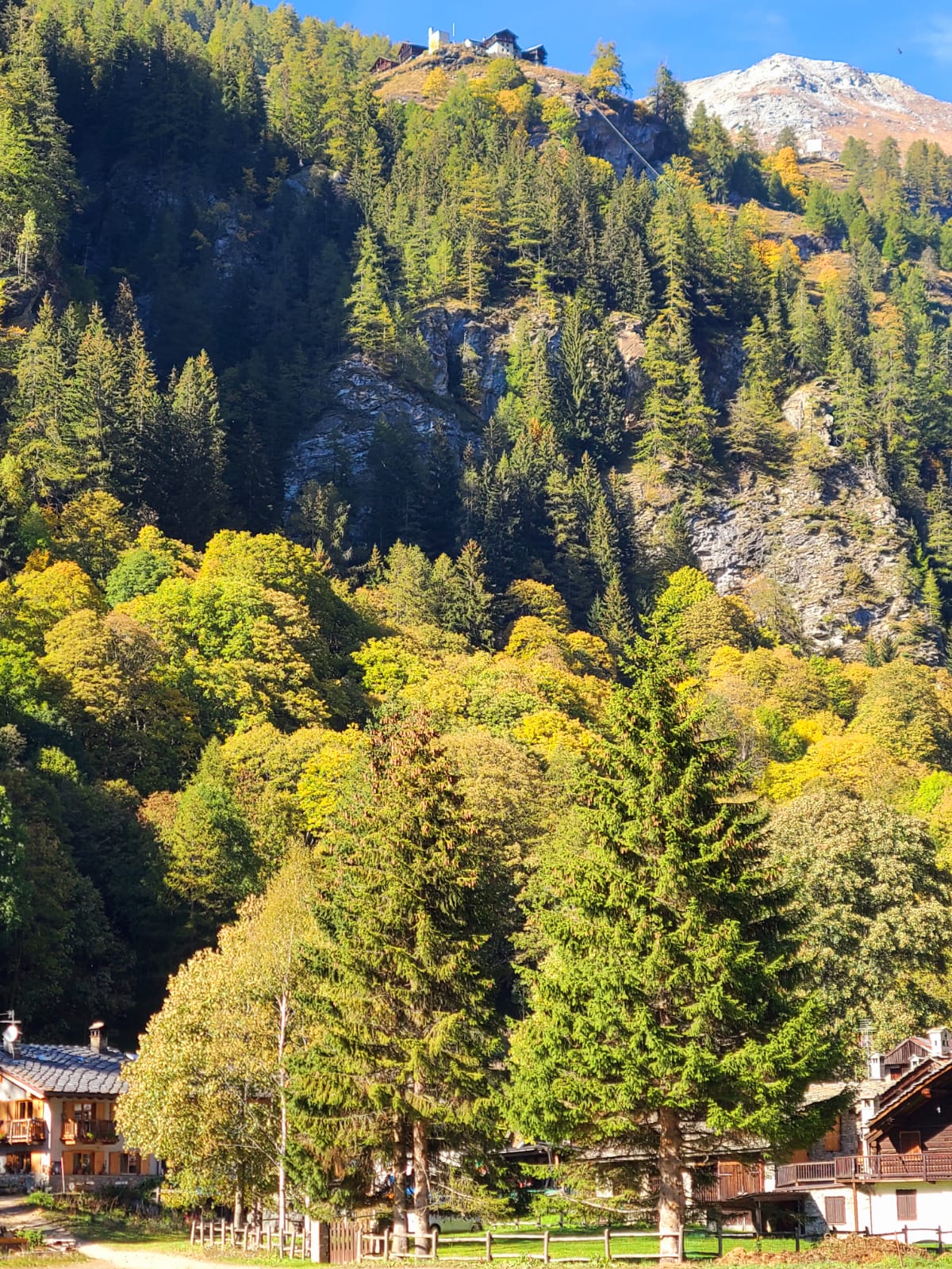 Il 15 ottobre sono andata a fare un’escursione con un amico. Se avessi avuto un’idea di cosa comportasse davvero questa escursione, non avrei mai provato a farla. Dall’hotel alla cima del sentiero (il sentiero sale su una montagna) la distanza era di 2,3 miglia, ma c’era un dislivello di 1200 piedi. Inoltre l’hotel (nel piccolo paese di Gressoney-Saint-Jean a Valle d’Aosta) si trova ad un altitudine di 4.500 piedi. Con mio grande stupore, sono sopravvissuta! (Tuttavia sono stata ovviamente esausta dopo.) Lungo il percorso, abbiamo trovato un ramo (perfetto da usare come un bastone) che è diventato il mio migliore amico. (Per il prossimo viaggo, porterò i bastoncini da trekking.)