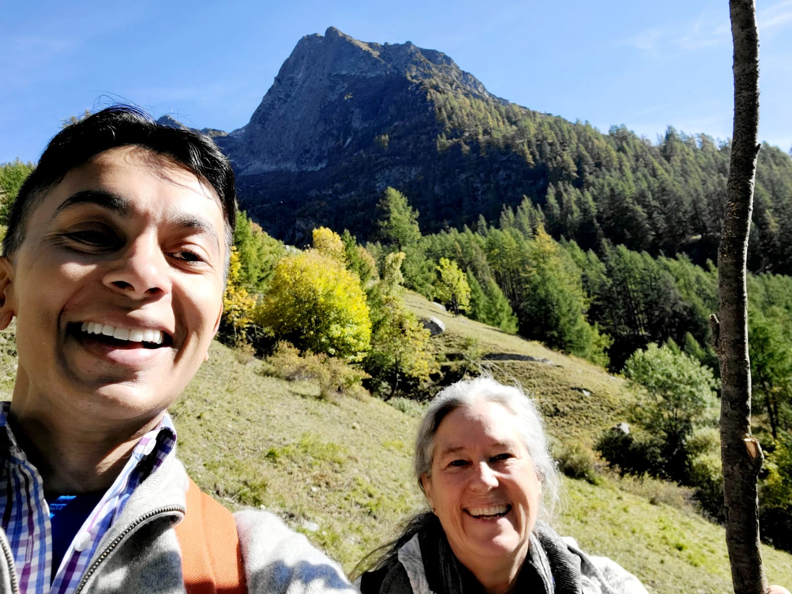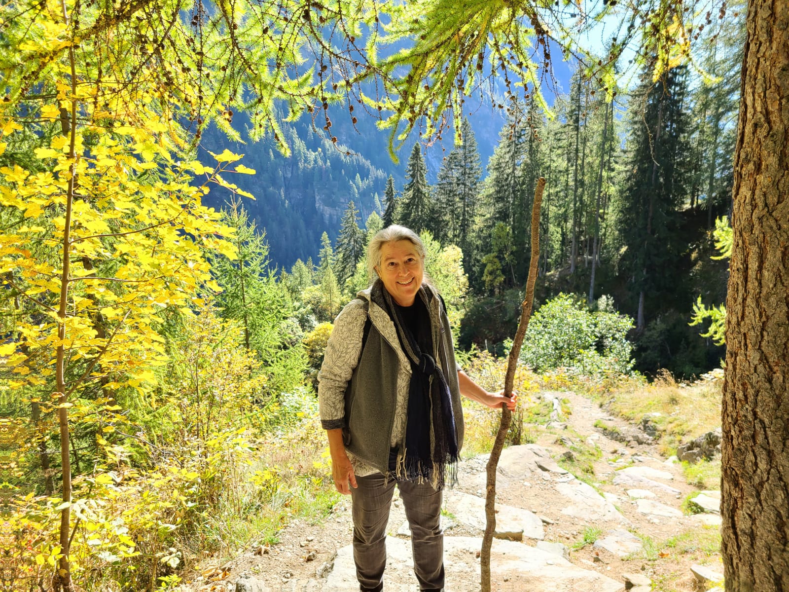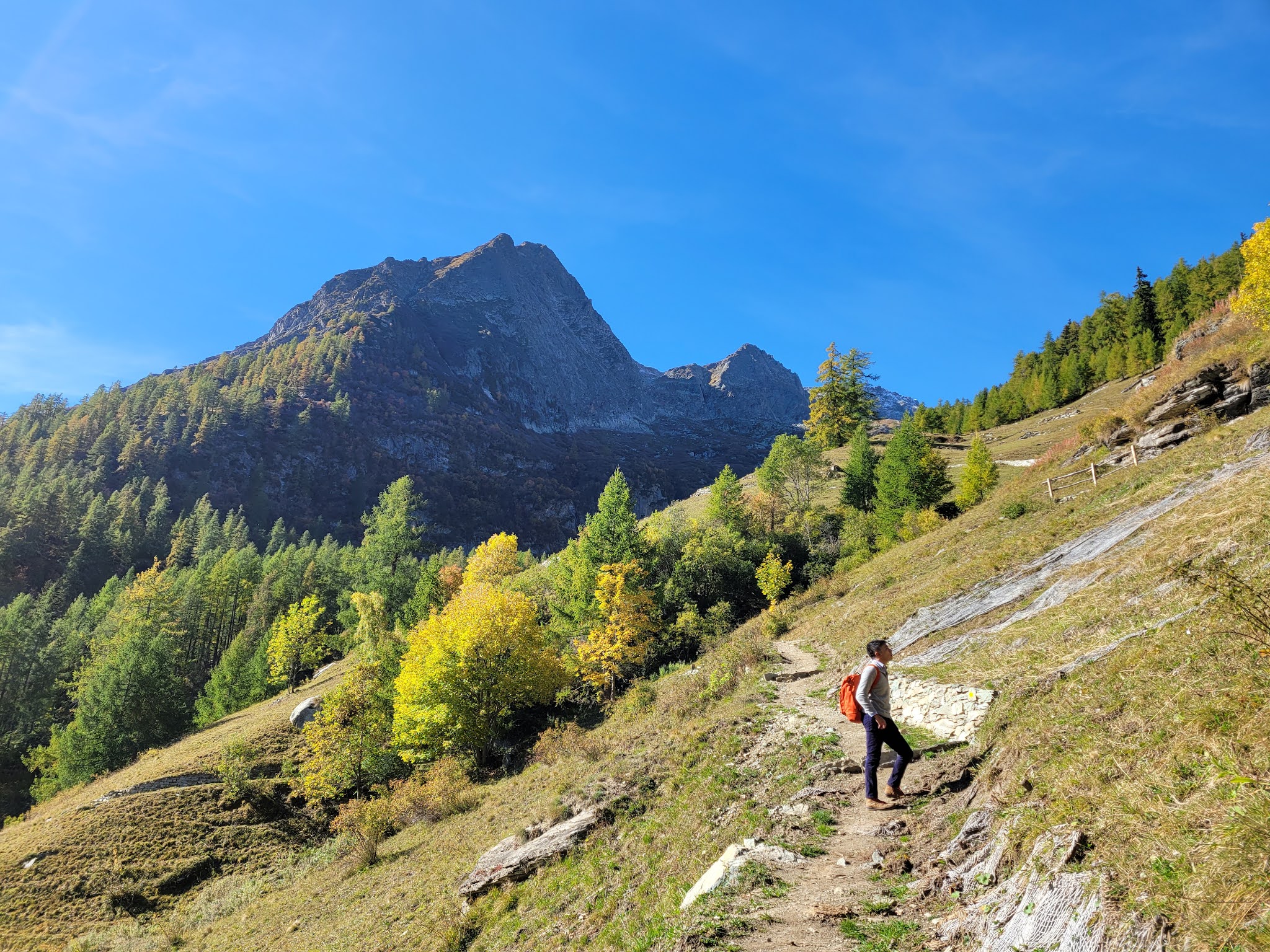On October 15th, I went on a hike with a friend. If I’d had any idea what this hike really entailed, I would never have attempted it. From the hotel to the top of the trail (the trail goes up a mountain) the distance was 2.3 miles, but there was a 1200-foot elevation gain. Also the hotel (in the little town of Gressoney-Saint-Jean in the Aosta Valley) is at an altitude of 4,500 feet to begin with. To my utter astonishment, I survived it! (Although of course afterward I was exhausted.) Along the way, we found a large stick, which became my best friend. (Next trip I’ll bring hiking poles.)