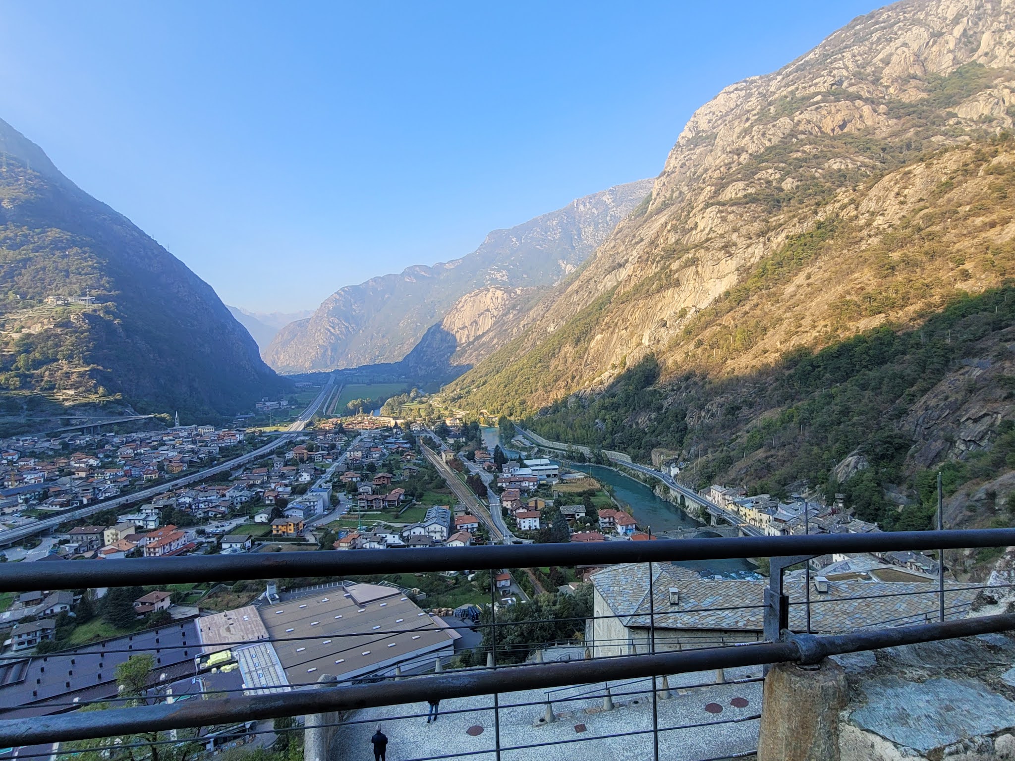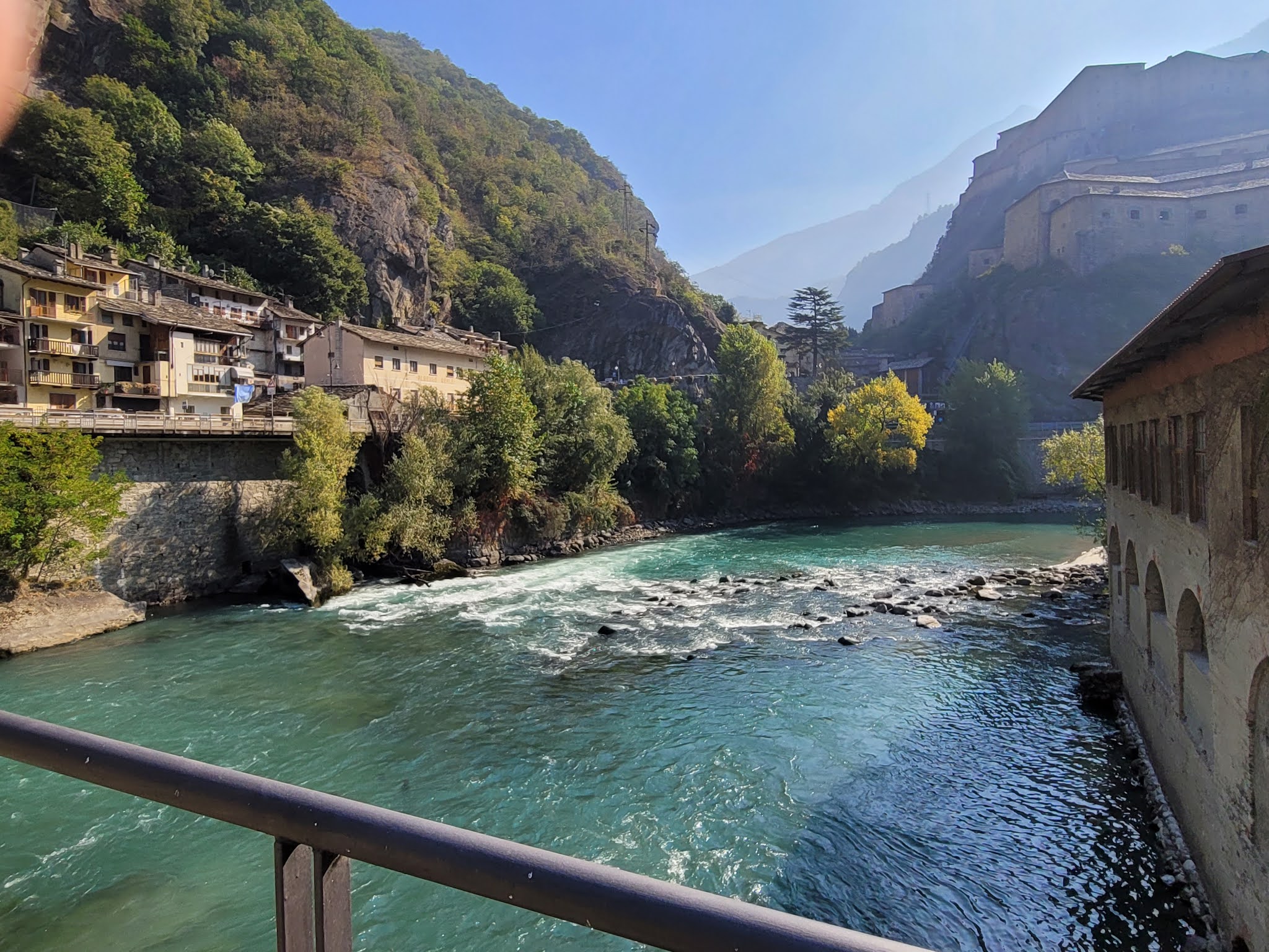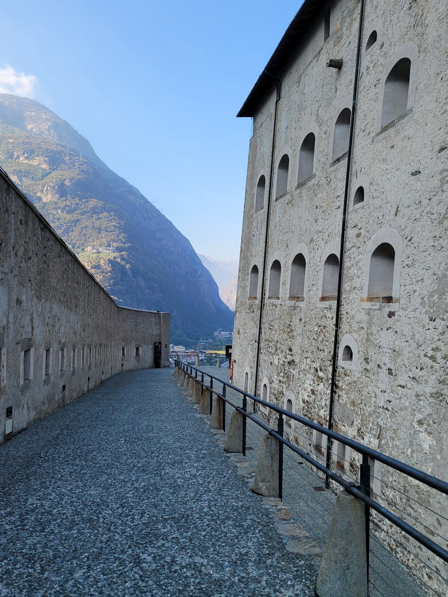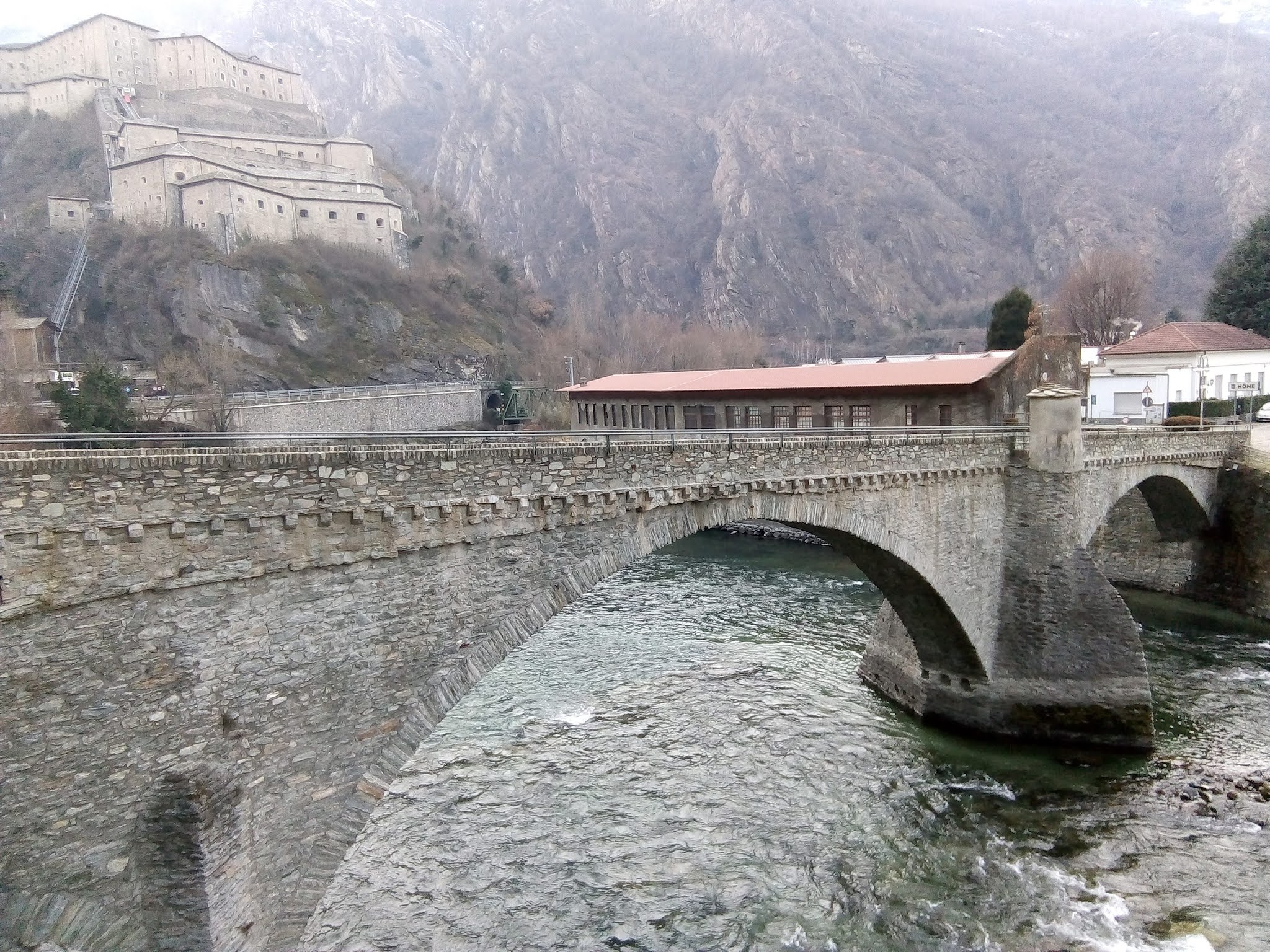 From Gressoney-Saint-Jean, my friend and I went to the village of Bard (pop. 134). On the other side of the river is the village on Hône (pop. 1,200). The altitude is lower here, about 1300 ft (400 m). These villages are located in a narrow gorge at the entrance to the Aosta Valley. High above the towns there is a huge fort, built in the 1830s, the Fort of Bard. It was built on the site of the other fortifications (a 10th-century castle and before that, a 5th-century structure).