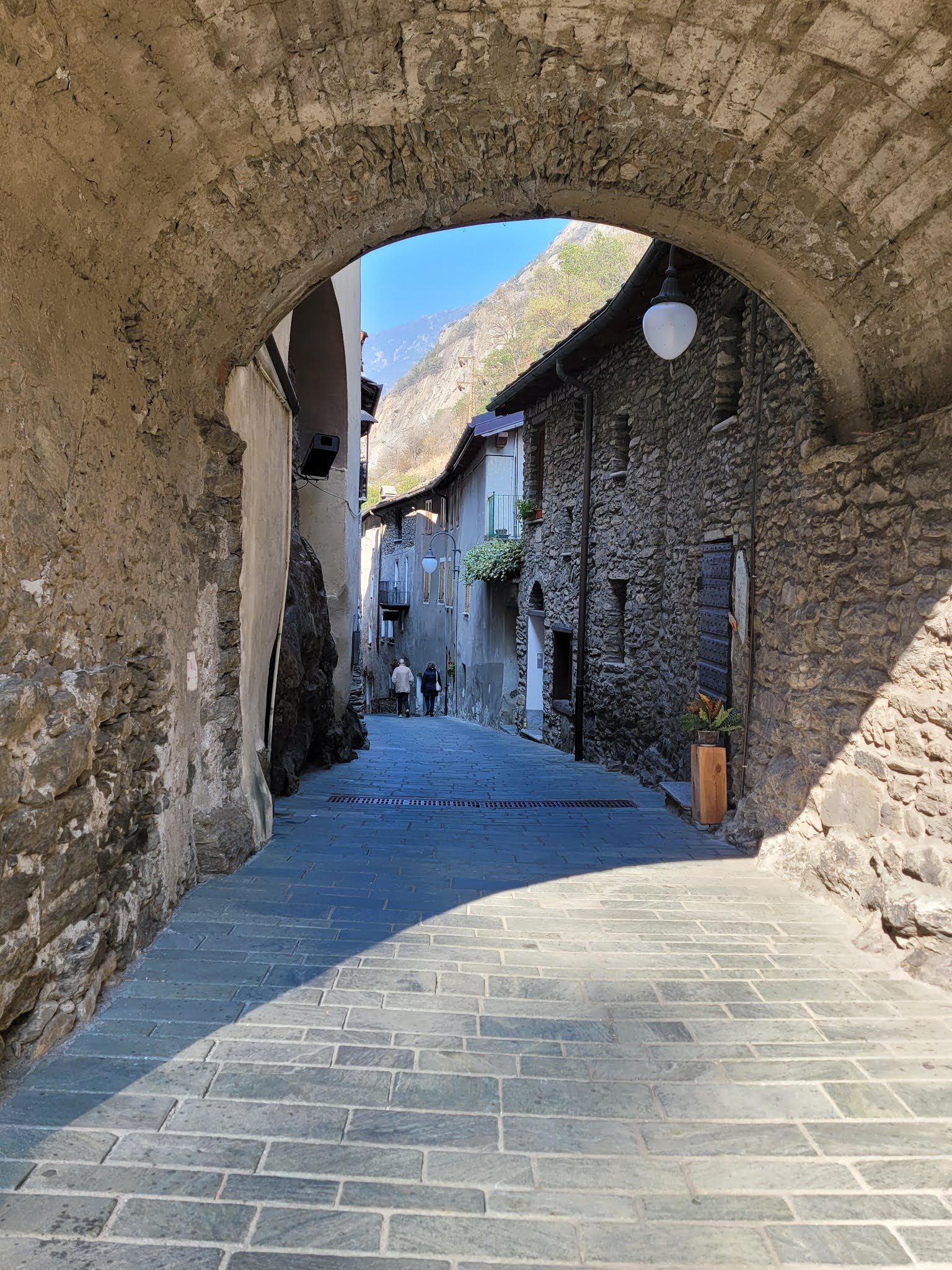 Da Gressoney-Saint-Jean sono andata con il mio amico al villaggio di Bard (134 abitanti). Dall’altra parte del fiume si trova il villaggio di Hône (1200 abitanti). L’altitudine qui è più bassa, circa 1300 piedi (400 m). Questi paesi si trovano in una stretta gola all’ingresso della Valle d’Aosta. In alto sopra i villaggi c’è un’enorme forte costruito negli anni diciotto-trenta, il Forte di Bard. Fu costruito sul posto di altre fortificazioni (un castello del X secolo e prima ancora una stuttura del V secolo).