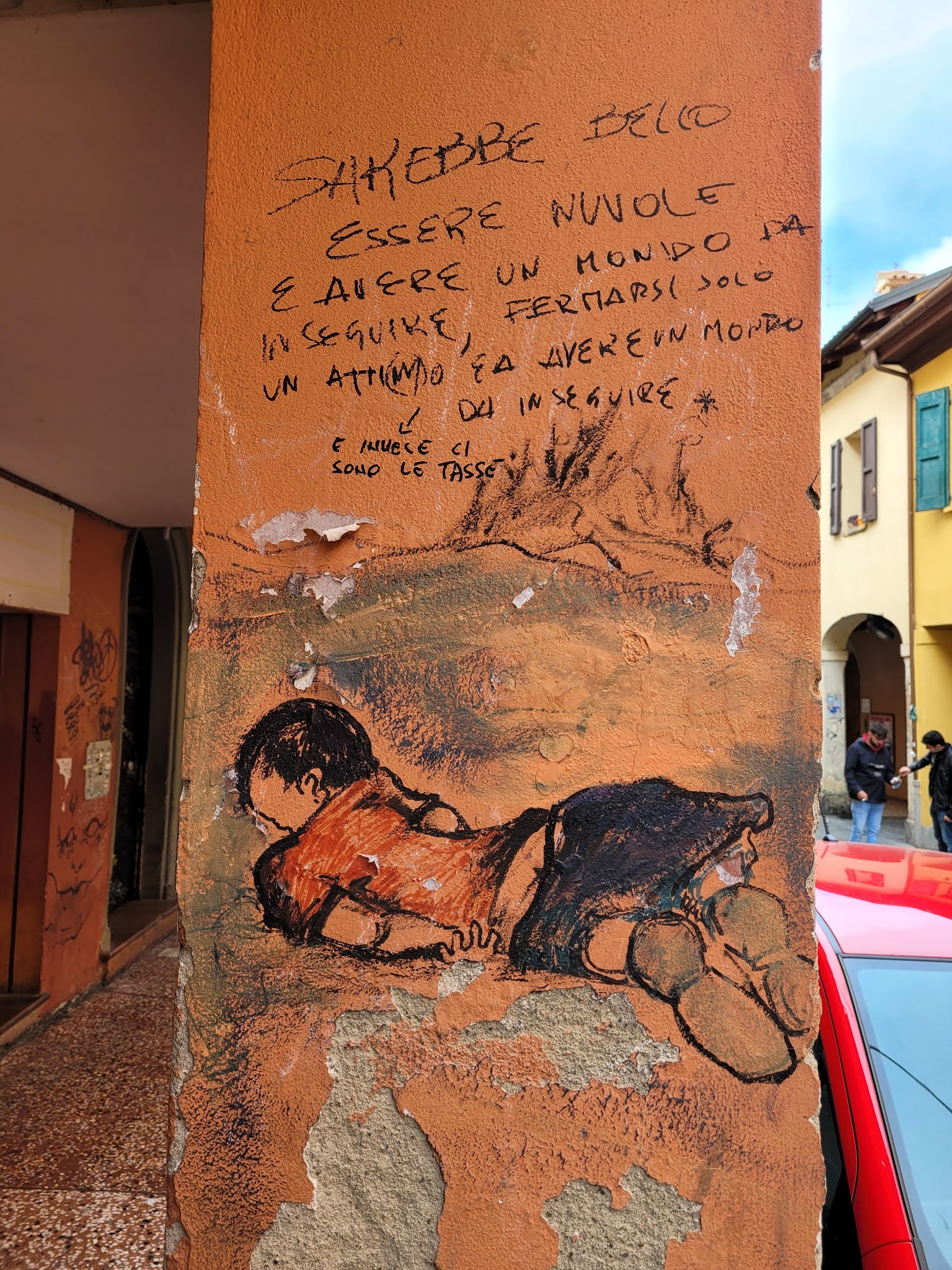 Translation: “It would be nice to be clouds and have a world to follow, to stop just for a moment and have a world to follow (and instead there are taxes).”