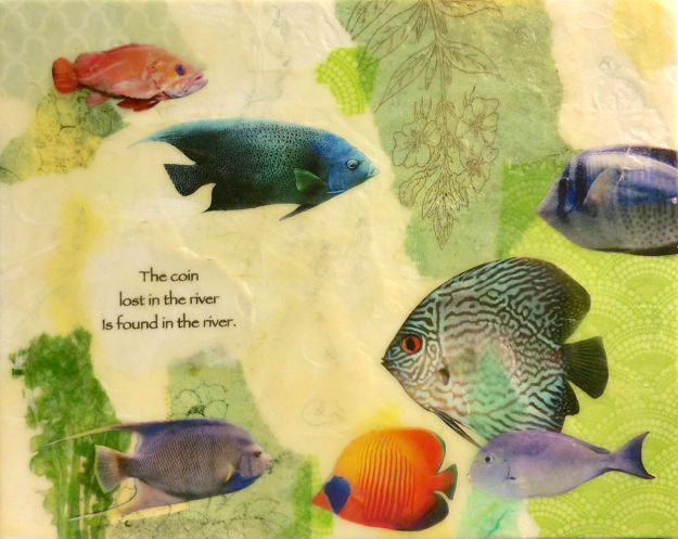 FIshes & Coral beeswax collage on canvas, 8″ x 8″