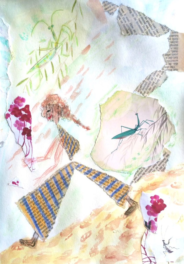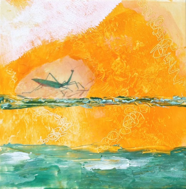 Mantis at the Beach cold wax & oil paint with collage on panel, 6″ x 6″